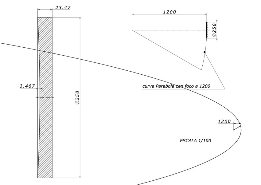 Diseño de Julián Orte del espejo parabólico de 258mm f 4,65.