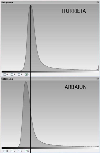 Vemos como el histograma de la foto hecha en Iturrieta está más desplazado a la derecha (hacia el blanco) indicativo de que el valor medio de iluminación de la foto es mas elevado. También se observa que, por efecto de tener la foto un fondo menos oscuro, la campana de distribución es mas ancha, menos contrastada.