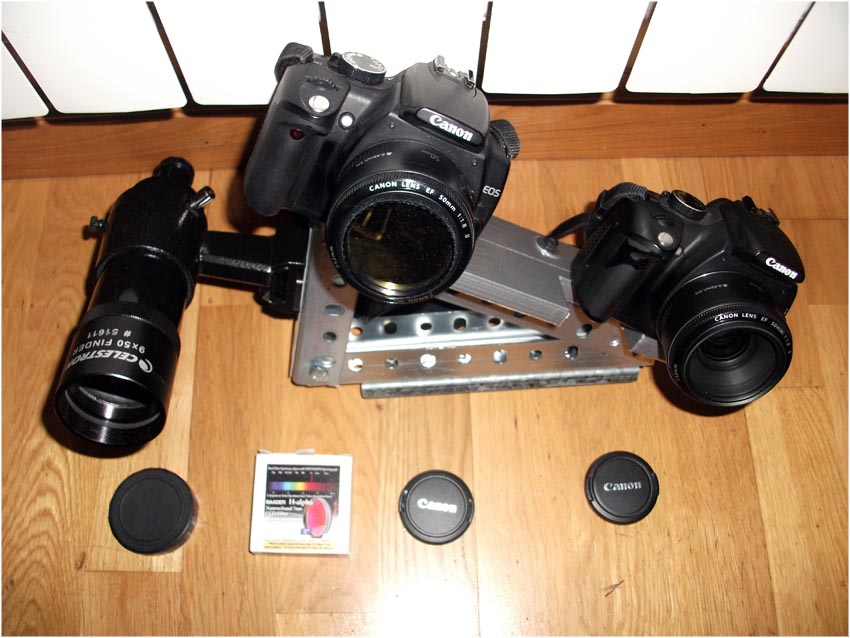 Ahora mi proyecto del verano es hacerlo con una resolución muy superior. Un mosaico de la Vía Láctea con un objetivo de 50mm. He duplicado el equipo fotográfico (dos cámaras, dos disparadores, baterías) por lo que, en principio, debería invertir la mitad de tiempo en la exposición. Una cámara sin filtros, y la otra con filtro H alfa.