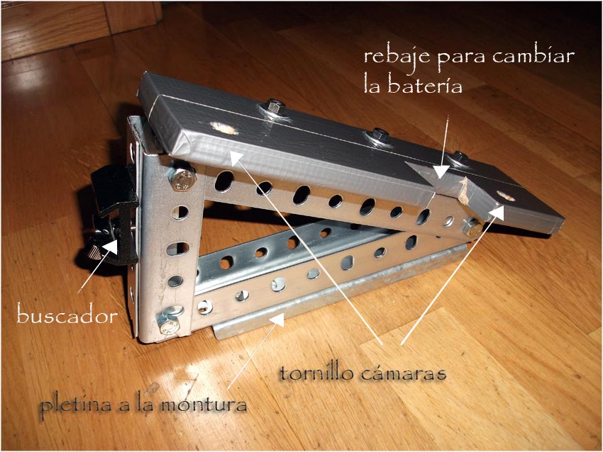 El triángulo se atornilla a la pletina que va a la montura (made in Txus). Para facilitar la colimación del sistema le he aplicado un buscador que seguro será de ayuda. Y creo que el último detalle que me faltaría, sería poner un pequeño listón detrás de las cámaras para que cuando se atornillen queden automáticamente alineadas.