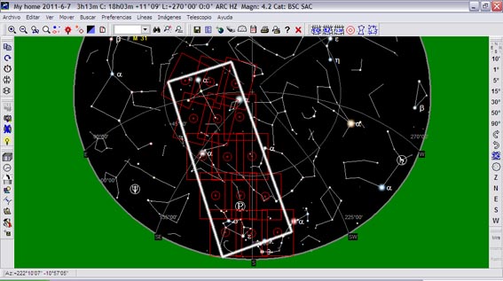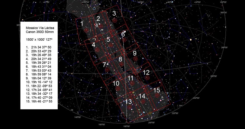 El mosaico constaría de 15 imágenes unidas en 3 X 5. Cada una de ellas sería la suma de 1,5 horas en H alfa y 1,5h en visual. Por lo que la imagen final sería de 45 horas, sin contar las 15h de tomas oscuras (darks).