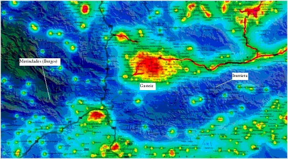 En el siguiente mapa de contaminación Lumínica vemos como la zona visitada parece que disfruta de cielos más oscuros que Iturrieta.