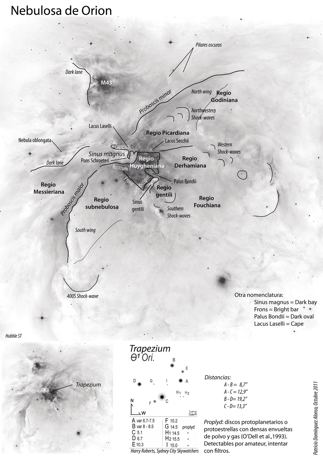 Jaime y yo llegamos a Iturrieta sobre las siete de la tarde. Para entonces Txus ya estaba allí con todo el tinglado montado. Teníamos ganas de empezar así que Jaime plantó su dobson y yo mi refractor de 5” bien cerquita para poder intercambiarnos los telescopios a lo largo de la noche. El primer destino no podía ser otro que M-42, la nebulosa de orión, nunca decepciona y la vista con ambos telescopios era soberbia. Os adjunto un mapa de esta nebulosa que marca los principales detalles visibles con telescopios de aficionados.