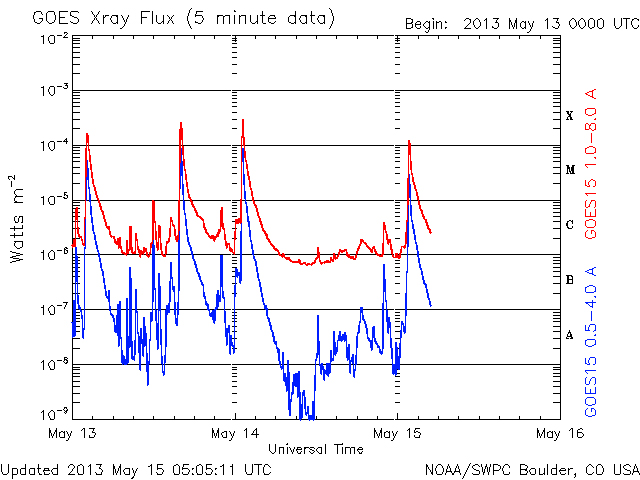 En esta otra web podemos ver la gráfica de la energía solar en rayos X. Se actualiza al minuto. Esta web la utilizaban en el Pic du Midi dentro del programa CLIMSO de seguimiento solar. La gráfica horizontal es el tiempo universal (en horario de verano sumar 2 horas), y la vertical los Watts por metro cuadrado. En principio no parece mucho, pero la Tierra tiene muchos metros cuadrados, muchos. Como podéis ver el 14 de mayo llegamos a un X2. El año pasado un X3 dió muchos problemas en Australia, sobre todo en radio.