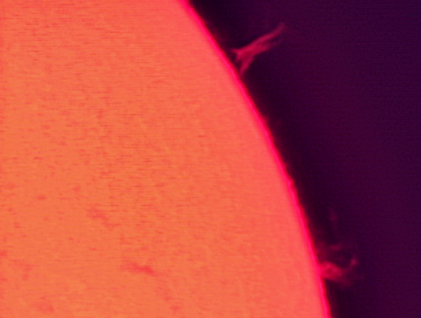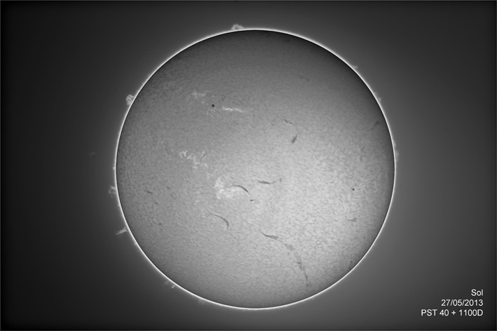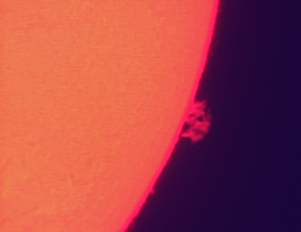 En los bordes podemos ver las protuberancias, incluso una despegada de la supercie en la izquierda. Dentro podemos ver alguna mancha, la granulación solar, zonas claras (fáculas) y una serie de filamentos que correponden a protuberancias vistas de frente