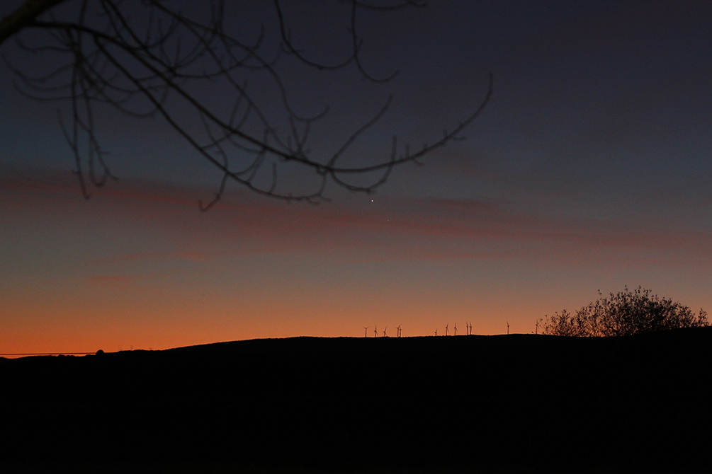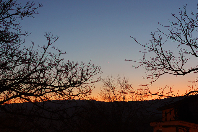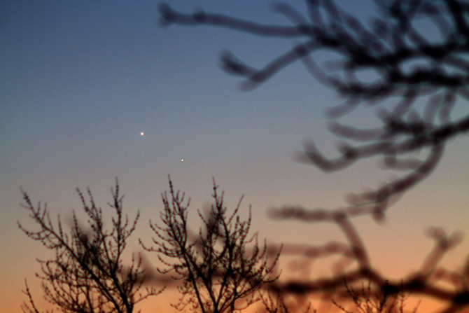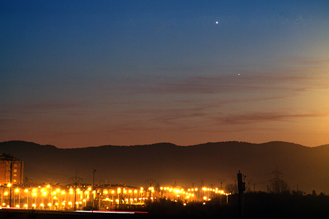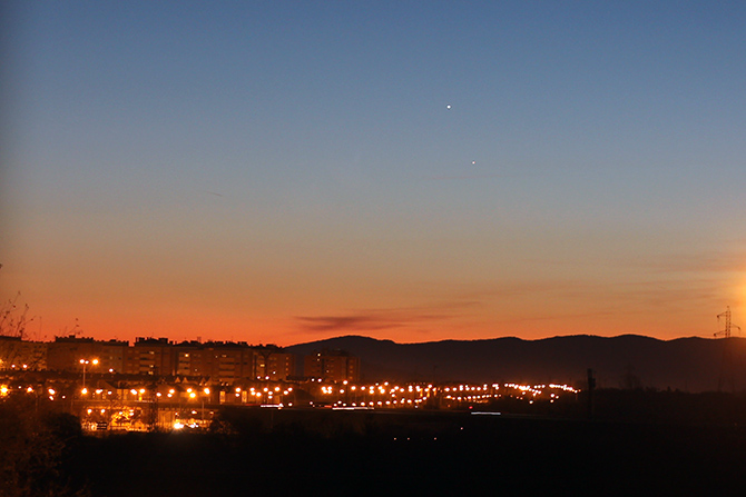 No es necesario alejarse de la ciudad para ver los planetas, eso sí, hay que tener el horizonte oeste sin obstáculos o farolas cercanas. A pesar de que el planeta Mercurio se conoce “desde siempre” no es fácil poder verlo; ya que como es el planeta más cercano al sol nunca se separa de él y siempre está a poca altura sobre el horizonte. Es más, Nicolás Copérnico (padre del sistema Heliocéntrico) nunca lo pudo contemplar desde su Polonia natal… que seguramente viene a ser parecida a Vitoria-Gasteiz. Lo primero que veréis será el brillante Venus, luego simplemente hay que buscar el otro punto, que estará bien cerca.