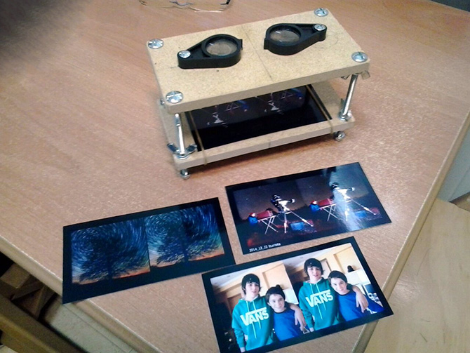 La idea era ver ambas imágenes por medio de un visor estereoscópico, es decir, dos lupas alineadas. Las lupas están montadas en una estructura con la medida para que ambas hagan foco donde colocamos la fotografía doble. Abajo el prototipo.