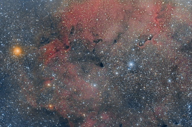 IC 1396 Nebulosa Trompa de elefante. Foto realizada en Korres el día 24-5-17 con cámara canon 1100 modificada y telescopio Long Peng ED 110 a f4.8. Son 30 fotos de 10 minutos cada una a ISO 800 total 5h de datos.. Apilado y procesado con PixInsight.