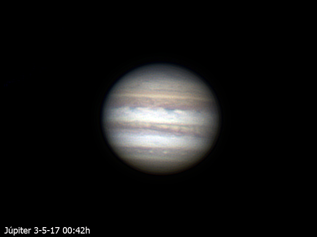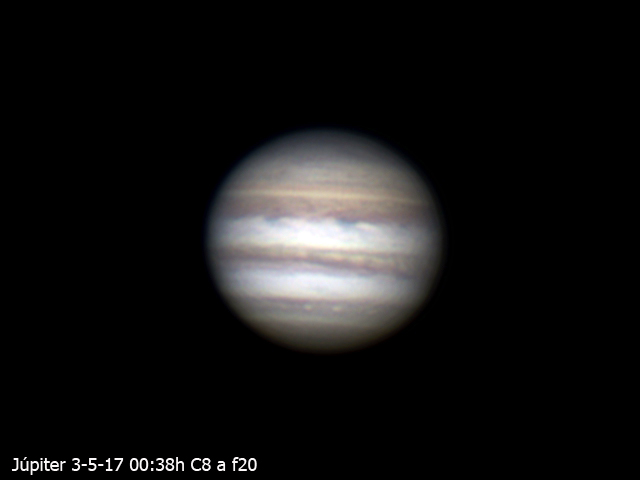 También te envío las fotos de Jupiter . Son vídeos de 60 seg con C8 a f20 y cámara ASI 120 MC-S. Vídeo capturado con Sharpcap y apilado con autoestaker, arreglado con Registax y Fiswork.