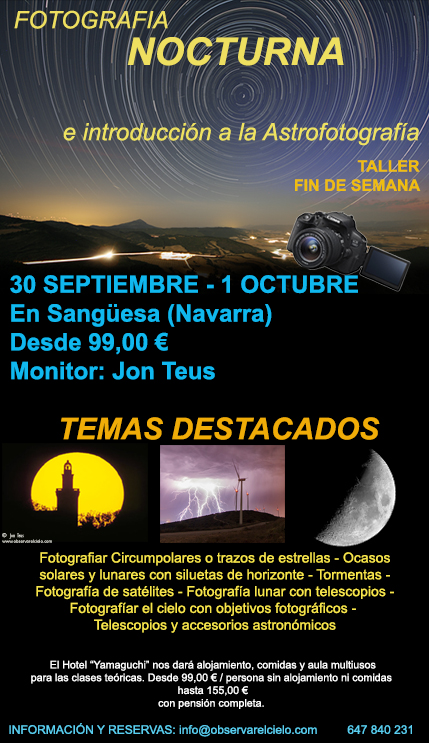 Taller Fotografía Nocturna 14 septiembre, 2017 14 septiembre, 2017 Importados Nuestro amigo Jon Teus ha organizado un Taller de fin de semana de Fotografía Nocturna en Navarra. Sin duda interesante, como todo lo que hace. Adjuntamos el cartel laotramitad
